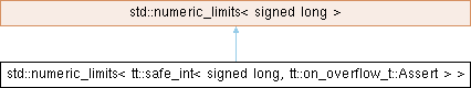 Inheritance diagram for std::numeric_limits< tt::safe_int< signed long, tt::on_overflow_t::Assert > >: