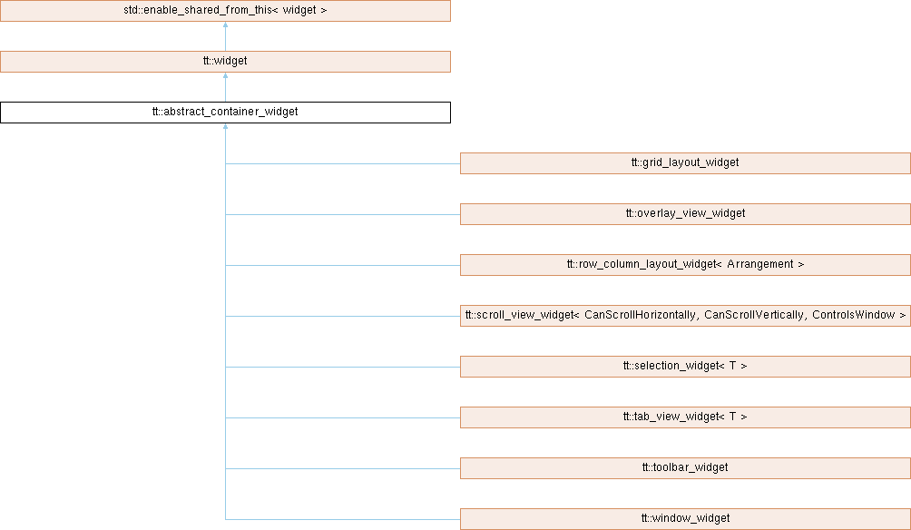 tt::widget std::enable_shared_from_this< widget > tt::grid_layout_widget tt::overlay_view_widget tt::row_column_layout_widget< Arrangement > tt::scroll_view_widget< CanScrollHorizontally, CanScrollVertically, ControlsWindow > tt::selection_widget< T > tt::tab_view_widget< T > tt::toolbar_widget tt::window_widget