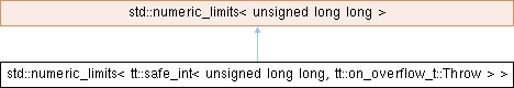 Inheritance diagram for std::numeric_limits< tt::safe_int< unsigned long long, tt::on_overflow_t::Throw > >: