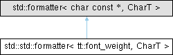 Inheritance diagram for std::std::formatter< tt::font_weight, CharT >: