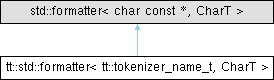 Inheritance diagram for tt::std::formatter< tt::tokenizer_name_t, CharT >: