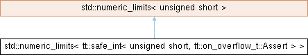 Inheritance diagram for std::numeric_limits< tt::safe_int< unsigned short, tt::on_overflow_t::Assert > >: