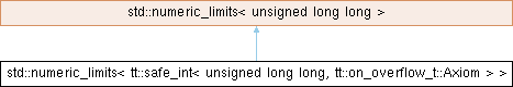 Inheritance diagram for std::numeric_limits< tt::safe_int< unsigned long long, tt::on_overflow_t::Axiom > >: