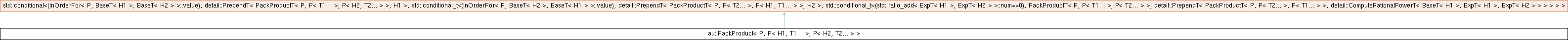 Inheritance diagram for au::PackProduct< P, P< H1, T1... >, P< H2, T2... > >: