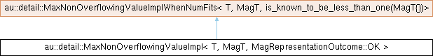 Inheritance diagram for au::detail::MaxNonOverflowingValueImpl< T, MagT, MagRepresentationOutcome::OK >: