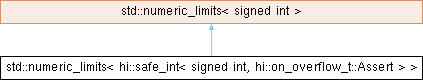 Inheritance diagram for std::numeric_limits< hi::safe_int< signed int, hi::on_overflow_t::Assert > >:
