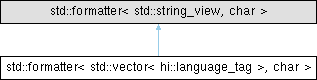 Inheritance diagram for std::formatter< std::vector< hi::language_tag >, char >: