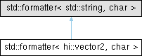 Inheritance diagram for std::formatter< hi::vector2, char >: