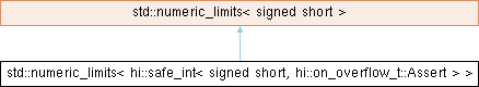 Inheritance diagram for std::numeric_limits< hi::safe_int< signed short, hi::on_overflow_t::Assert > >: