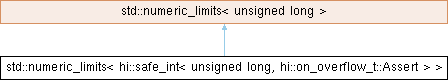 Inheritance diagram for std::numeric_limits< hi::safe_int< unsigned long, hi::on_overflow_t::Assert > >: