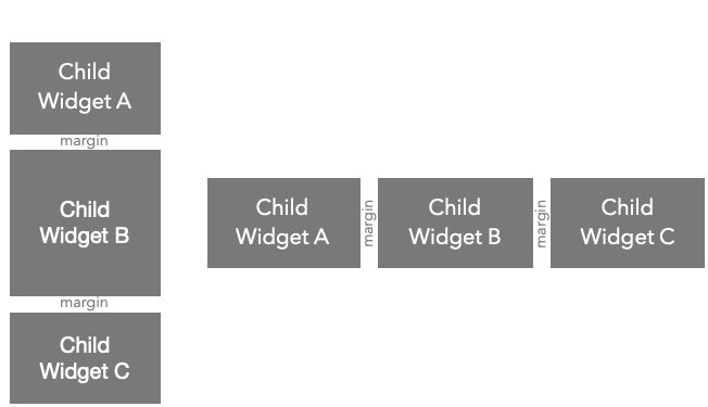 The row/column widget will calculate the size of the row or column based on the minimum, preferred and maximum size of each child widget contained in them. Margins are also taken into account in the spacing between the child-widgets.