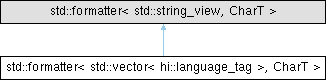 Inheritance diagram for std::formatter< std::vector< hi::language_tag >, CharT >:
