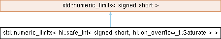 Inheritance diagram for std::numeric_limits< hi::safe_int< signed short, hi::on_overflow_t::Saturate > >: