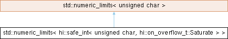 Inheritance diagram for std::numeric_limits< hi::safe_int< unsigned char, hi::on_overflow_t::Saturate > >: