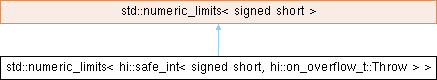 | Public Member Functions inherited from std::numeric_limits< signed short > | |