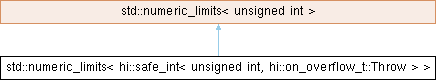 Inheritance diagram for std::numeric_limits< hi::safe_int< unsigned int, hi::on_overflow_t::Throw > >: