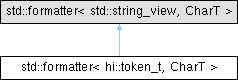 Inheritance diagram for std::formatter< hi::token_t, CharT >: